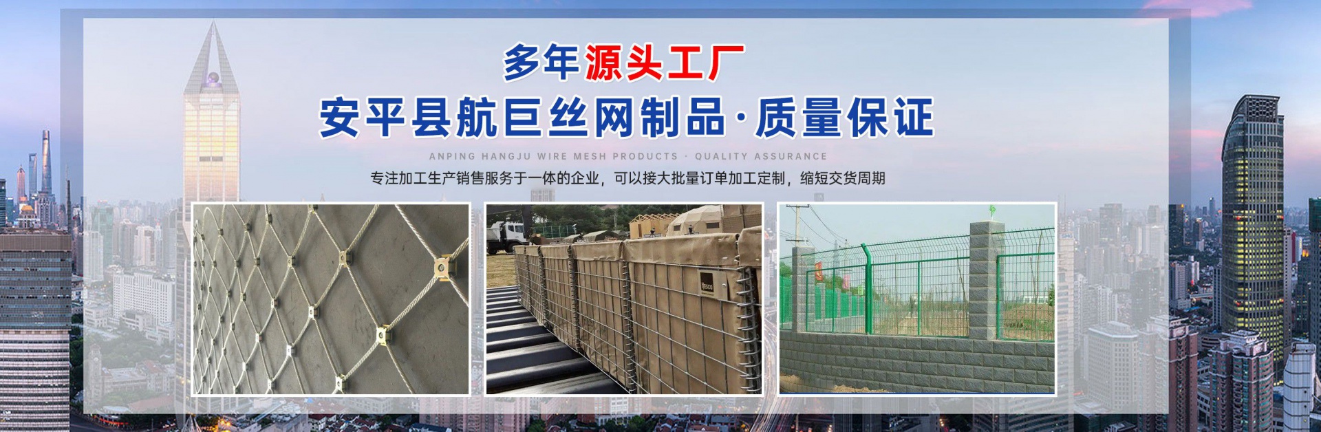 格賓石籠網(wǎng),雷諾護(hù)墊,麥克排水墊,加筋麥克墊,市政護(hù)欄,防爆籠,主動防護(hù)網(wǎng),被動防護(hù)網(wǎng),電焊網(wǎng)片,鋼格柵板-安平縣航巨絲網(wǎng)制品有限公司 公司簡介/ ABOUT